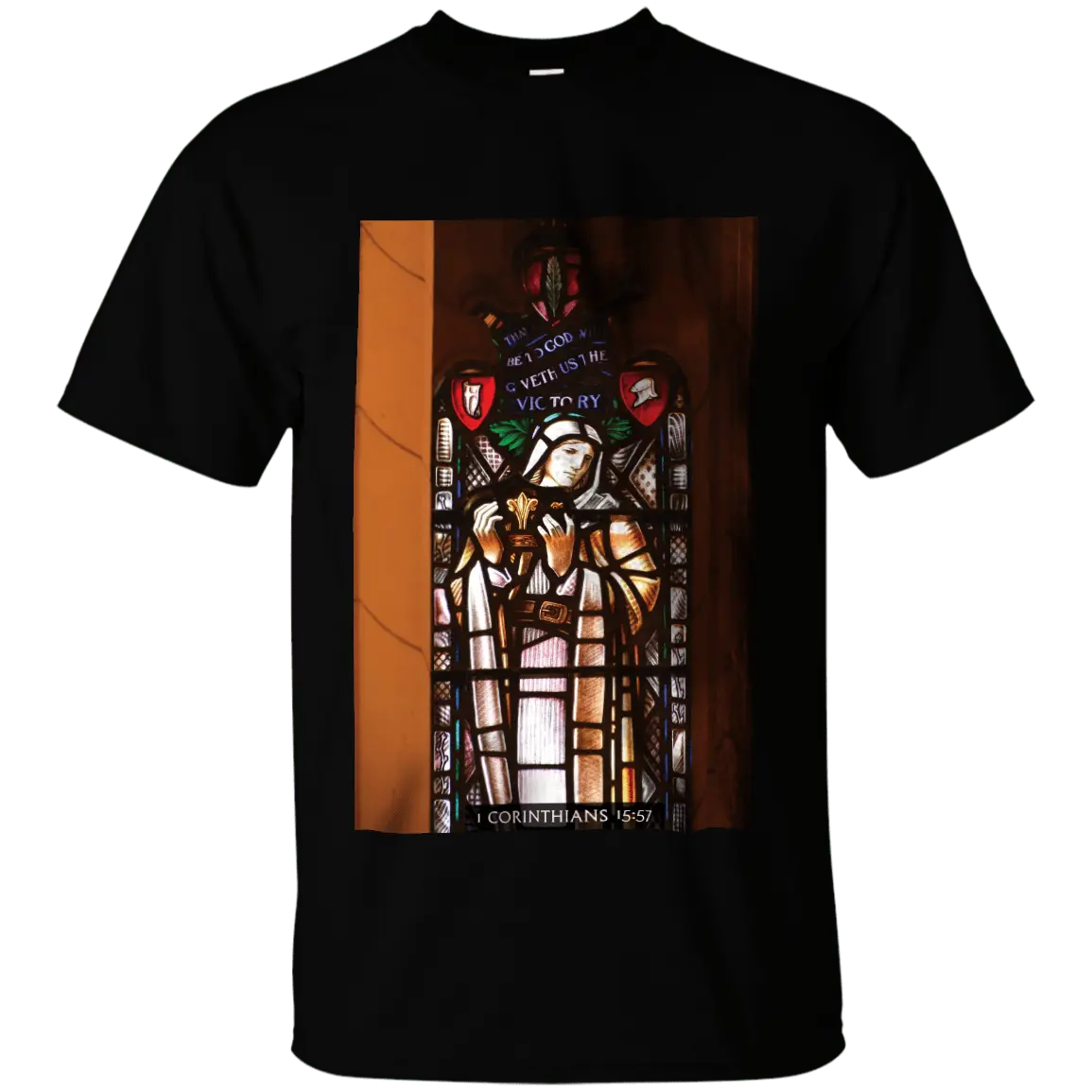 This T-shirt shows one of the 12 images displayed in the East stained glass windows of the peace Tower. It quotes the Scripture verse from 1 Corinthians 15:57 – Thanks be to God who giveth us the victory.